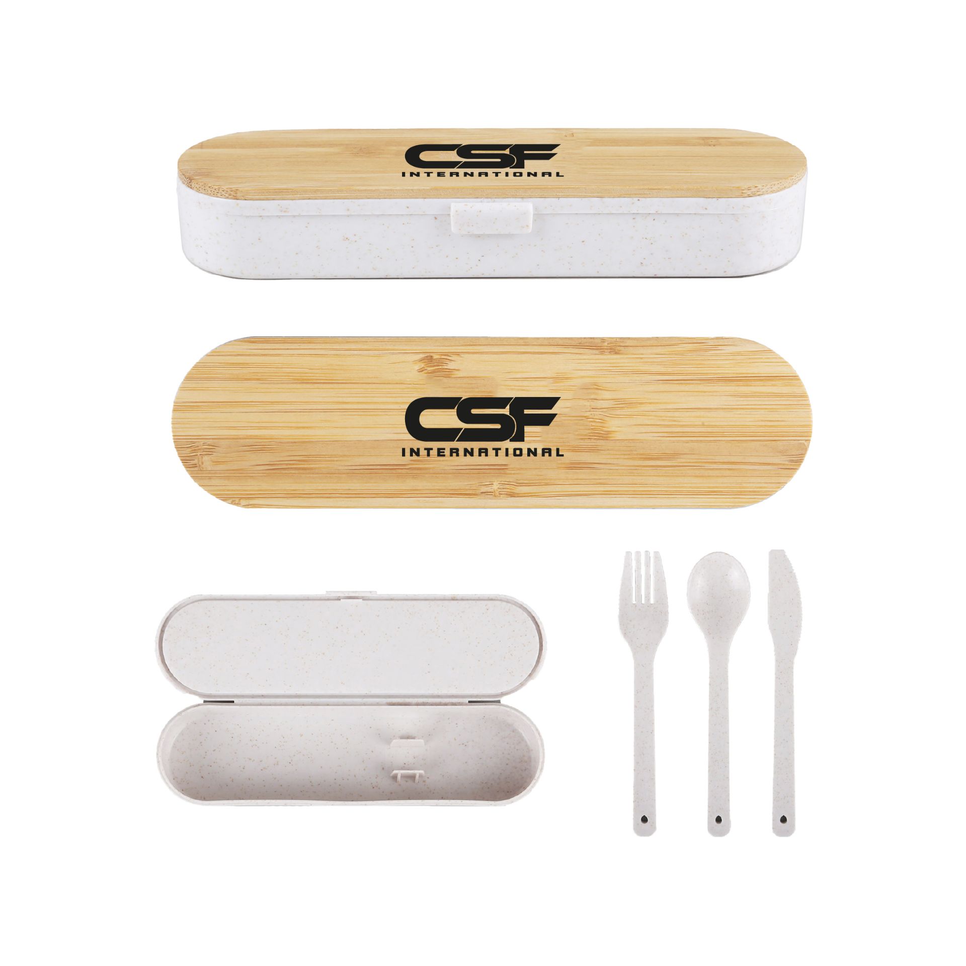 Si vous n'avez que des serviettes, vous serez ravi d'avoir le coffret d'ustensiles Dojin. Fabriqué à partir d'un mélange de paille de blé et de plastique, ce kit compact comprend une fourchette, un couteau et une cuillère réutilisables, qui se rangent facilement dans un étui de transport fin. Le couvercle en bambou apporte une finition soignée et naturelle. Idéal pour les événements, déjeuners ou conférences où l'on sert des plats, mais pas d'ustensiles.